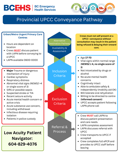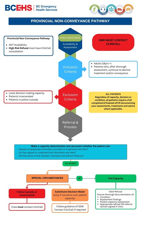 Non-conveyance refers to situations where a patient assessed by BCEHS paramedics is not transported to hospital, either by the patient’s informed personal choice or through clinical referral to an alternative clinical pathway.