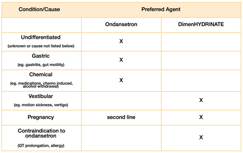 - Use an alternative agent if the first line is ineffective: A single agent is effective in most patients. If the first line agent is ineffective after 15-30 minutes, it is reasonable to consider providing a second antiemetic.