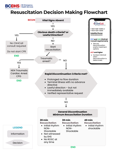 ACP and CCP: 75% of cardiac arrests in BC are attended to by ACP paramedics. ACP and CCP practitioners can independently apply both rapid and general discontinuation criteria but must consult with CliniCall for confirmation before discontinuing resuscitation efforts and implementing ROLE criteria. Evidence suggests that cardiac arrests in BC have improved survival and neurological outcomes if an ACP unit arrives within 10 minutes of 911 call (Grunau., 2019).