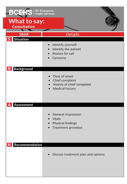 SBAR: Only used when calling CliniCall and speaking to EPOS or a PS for a more concise report, but you can also use ATMIST AMBO if preferred. However, never use the SBAR for anything other than CliniCall consults.