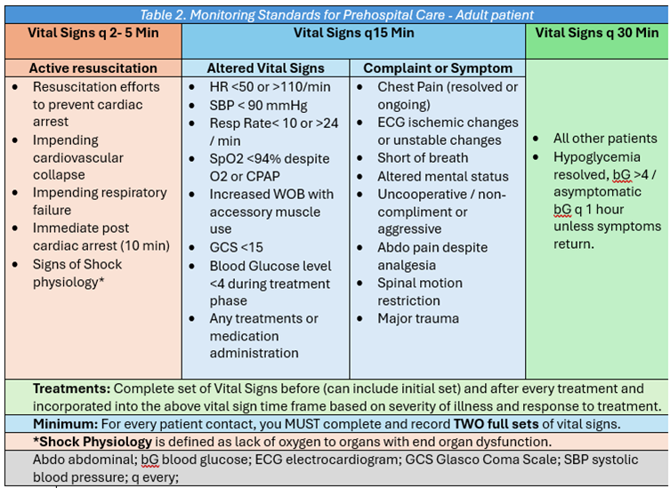 Every patient encounter and assessment MUST include at a minimum a baseline set of vital signs. Vital sign frequency is influenced by patient condition, treatments, disposition of conveyance and length of time with patient.
