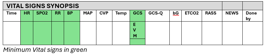 Minimum time interval for Vitals: Frequency of vital signs is in context to the patient’s condition, and you may choose to increase the frequency, or in cases where a BP cuff could cause significant pain or patient harm, modify your approach.