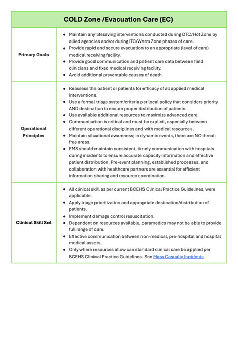 - Responder safety and threat mitigation first — Standard medical care will only occur in the Cold Zone.